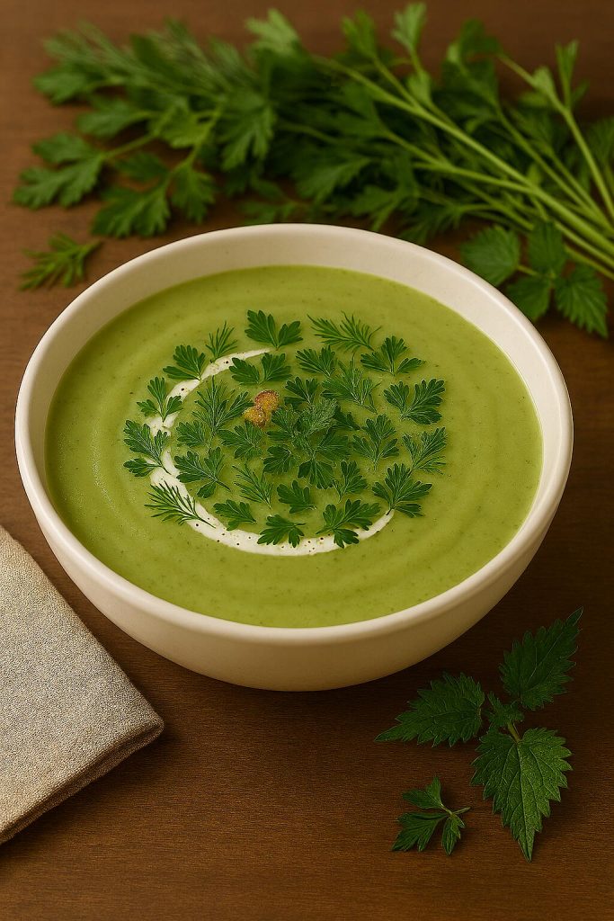 Die Butter in einem Topf zerlassen. Die Zwiebel würfeln und in der Butter glasig andünsten. Die Kraft-Gourmet Würze und die Dinkelflocken dazugeben und kurz mitdünsten. Mit der Milch ablöschen. In der Zwischenzeit die Wildkräuter und Lichtäther Kraftpflanze mit dem Wasser im Vitamix zerkleinern und zu der Mischung im Topf geben. Mit Salz, Kräutersalz, Muskatnuss, Pfeffer und Koriander würzen und ca. 15 Min. leicht köcheln lassen. Dann den Brennnessel Balsam und den Schmand dazu geben und im Vitamix kurz aufmixen. In Teller oder Tassen füllen und mit Blüten garnieren.