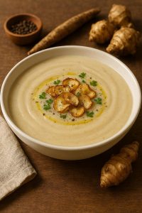 Zutaten für 4 Personen als Beilage: Zubereitung: Gourmet-Topinambur waschen und trocknen lassen. Kräuter im Mörser zerkleinern und mit den restlichen Zutaten in einer Schüssel vermengen. Topinambur zur